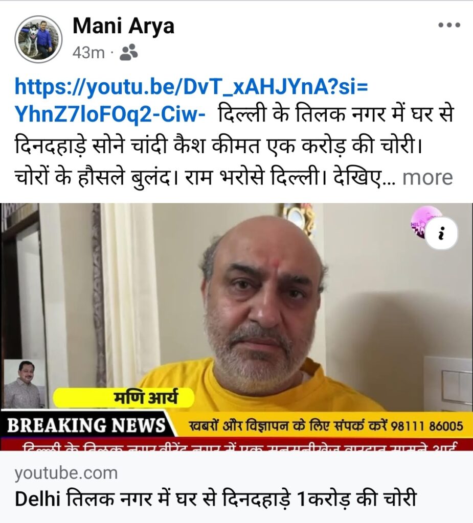 दिल्ली के तिलक नगर वीरेंद्र नगर में घर से दिनदहाड़े 1 करोड़ आभूषणों नगदी की चोरी