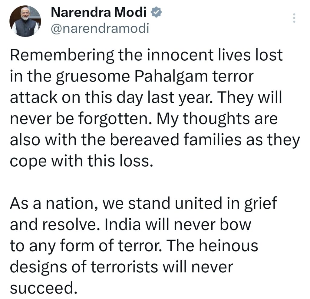पहलगाम में हुए भीषण आतंकी हमले की पहली बरसी पर प्रधानमंत्री नरेंद्र मोदी ने पीड़ितों को श्रद्धांजलि अर्पित की; कहा आतंकवाद के आगे नहीं झुकेगा भारत